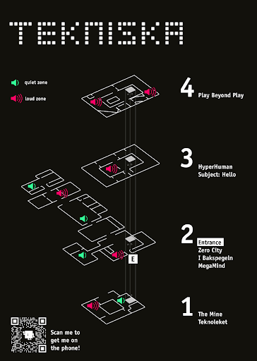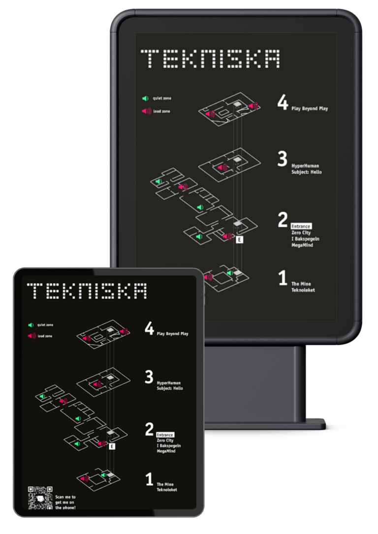 Our final concept includes sound-level detectors spread out throughout the museum. Screens with the map showing the live sound levels will be installed at the entrance and on all floors so that visitors can get an idea of the sound volume throughout the museum when they arrive. On each map, there will be a QR code for visitors to scan and bring the map with them on their phones. This concept was presented at the National Museum of Science and Technology in Stockholm.