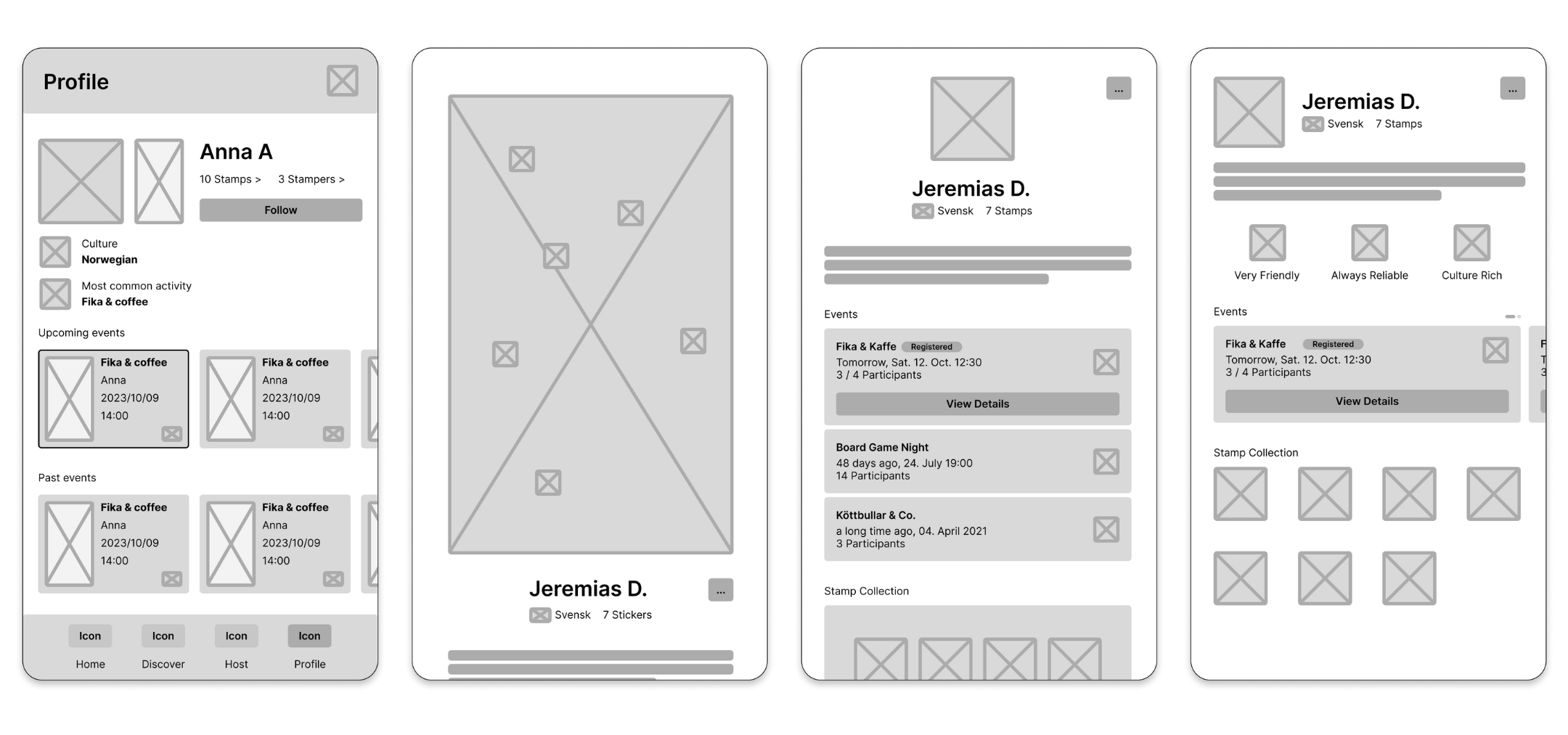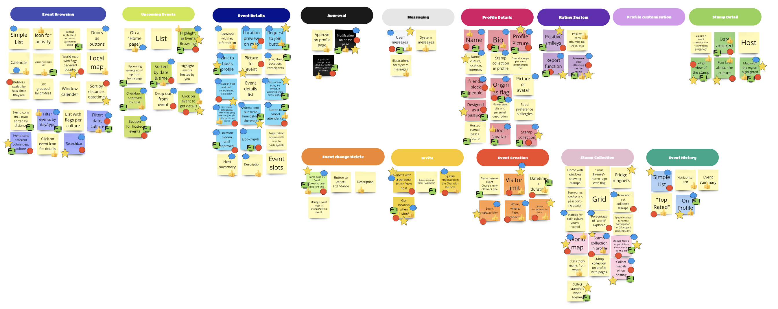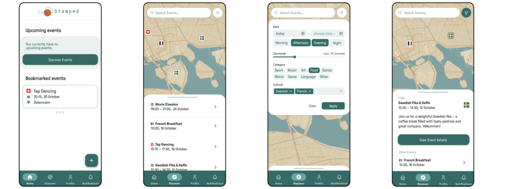 After brainstorming various ideas, we decided on creating an event app. We conducted parallel sketching to explore different alternatives for ensuring that both locals and immigrants would want to join these events. As a solution, we brainstormed “rewards” for joining and hosting events. Ultimately, we settled on a location-based event app where users would receive stamps, similar to passport stamps, when they explore different cultures.