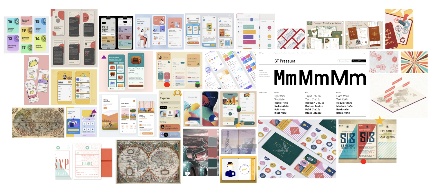 Once the wireframes were complete and we were ready to create the digital prototype, we created a moodboard to determine the desired feel of the app. Since we decided to use passport stamps in our app, we aimed for a vintage, classic design.