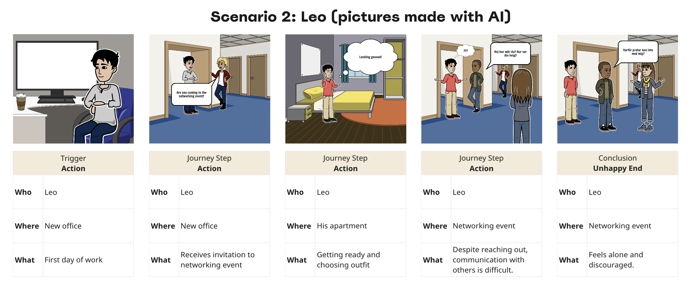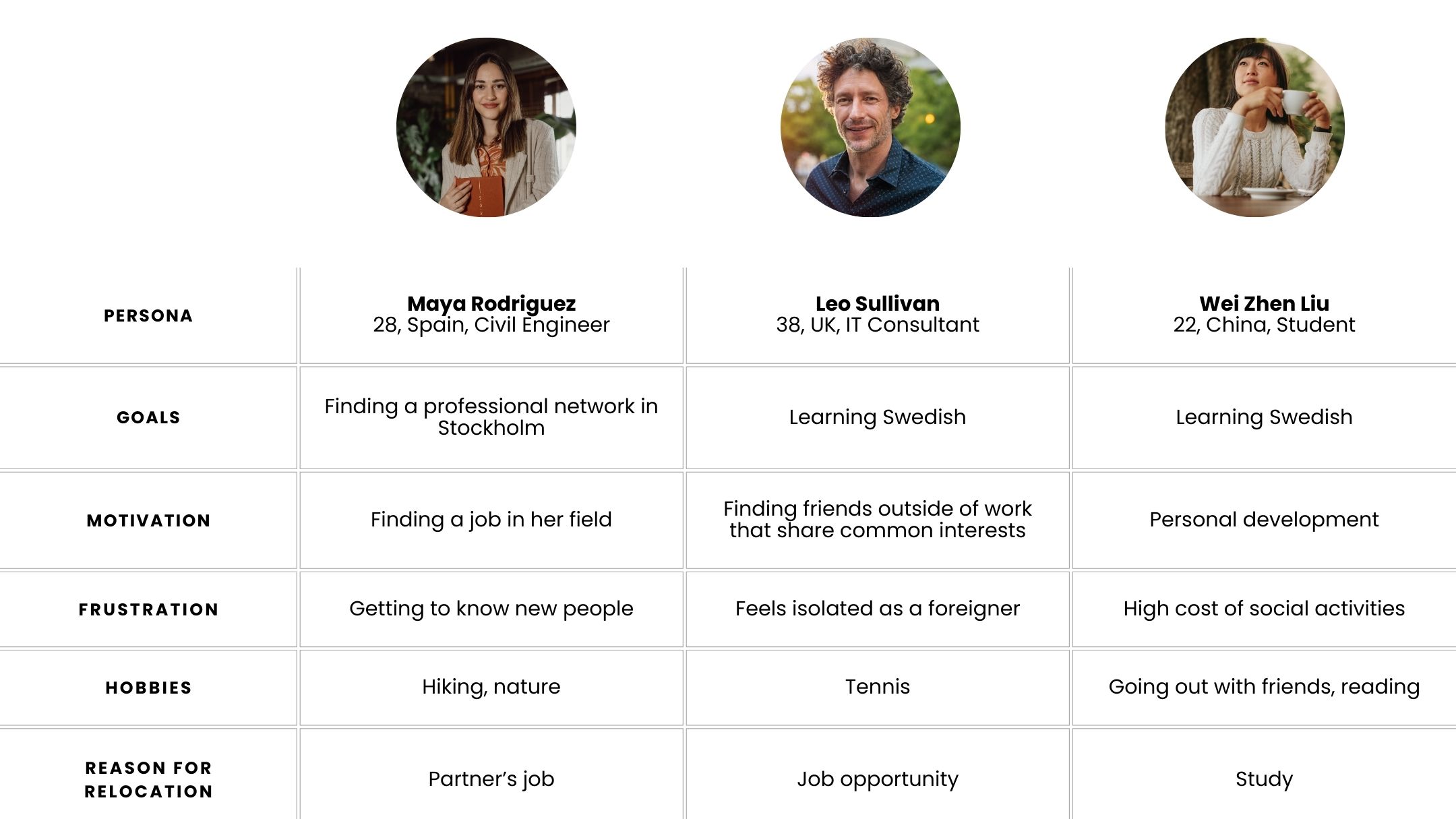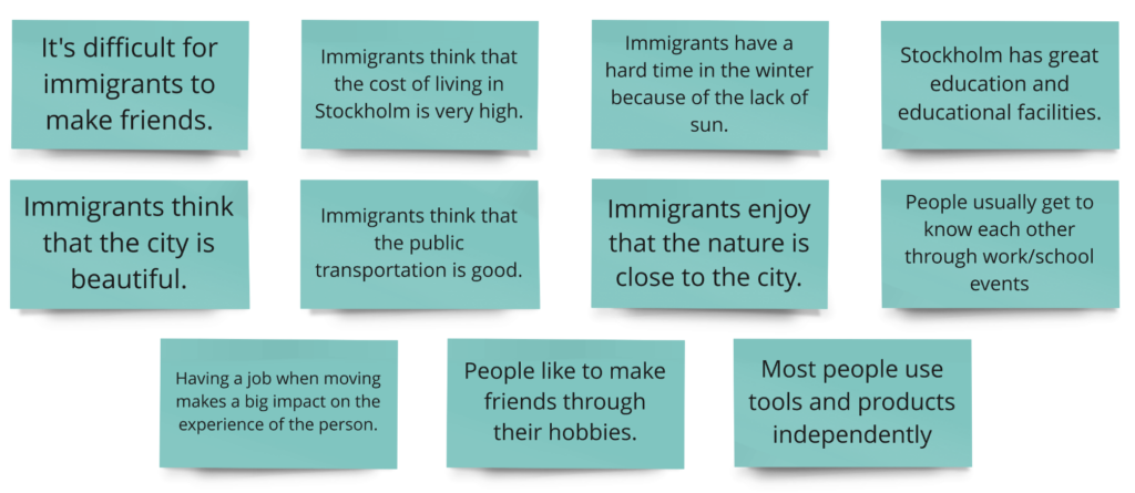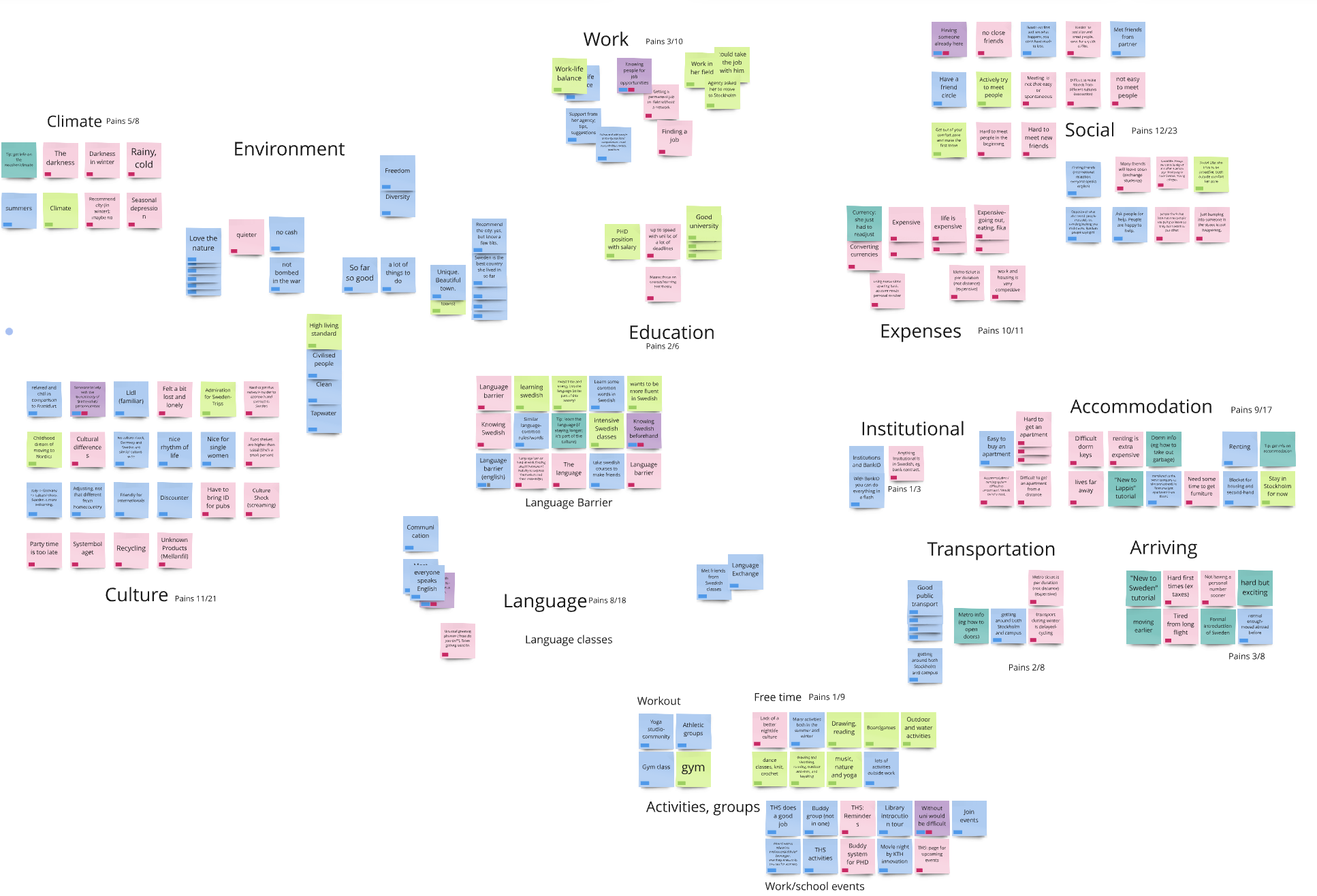 We aimed to understand what the initial period in Stockholm is like for our users, specifically whether they felt they could interact with locals and how they made friends. We conducted semi-structured, 30-minute interviews with seven participants. Afterward, we colour-coded and clustered insights from each interview. These clusters led to 11 conclusions about the participants’ experiences when moving to Stockholm. Based on these conclusions, we created personas.