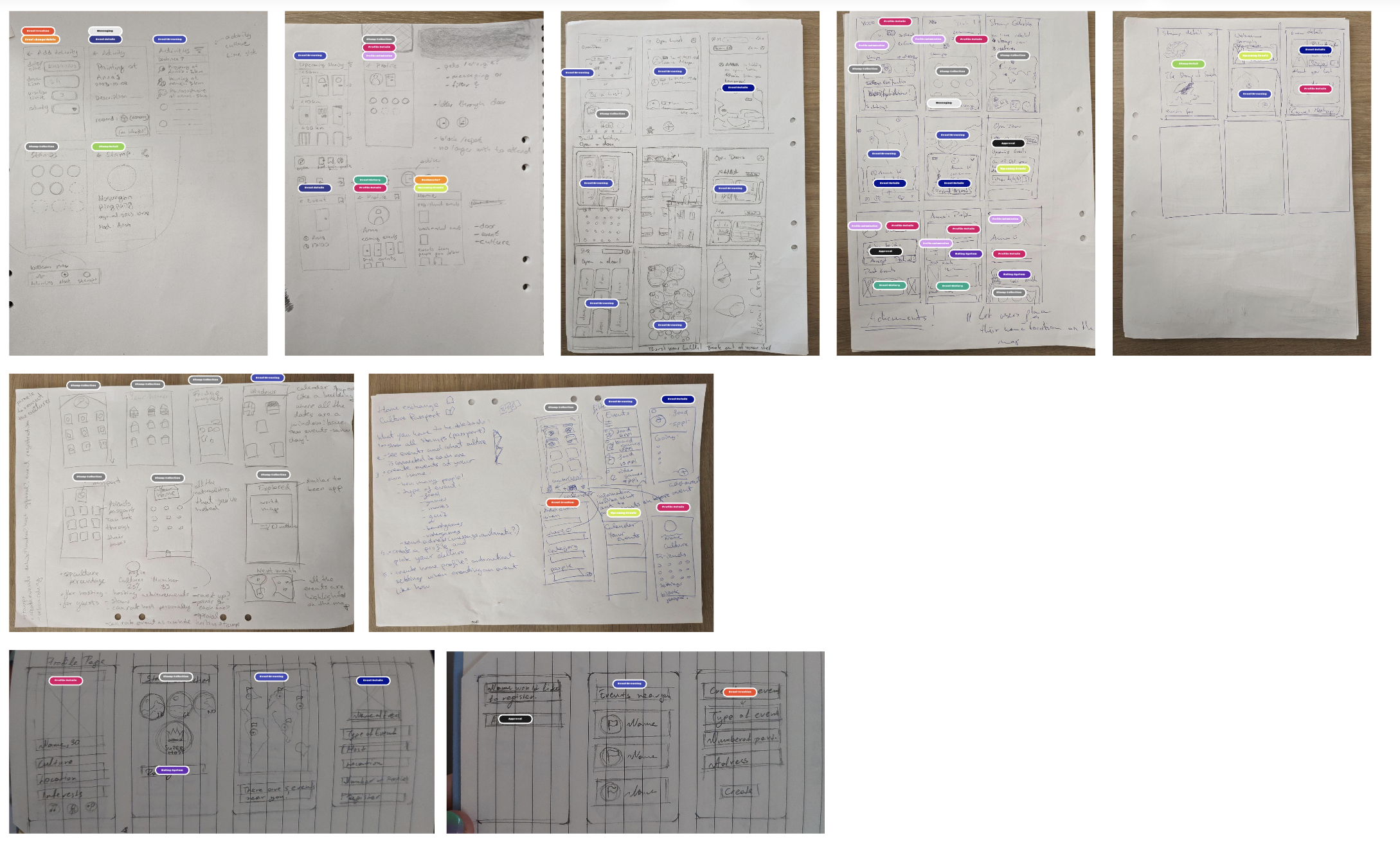 Based on the chosen features, we conducted parallel wireframing for the main pages of the app to generate as many ideas as possible for their structure. We aimed to make the app as simple and user-friendly as possible. By brainstorming separately, we avoided influencing each other and were able to find the simplest and cleanest solutions.